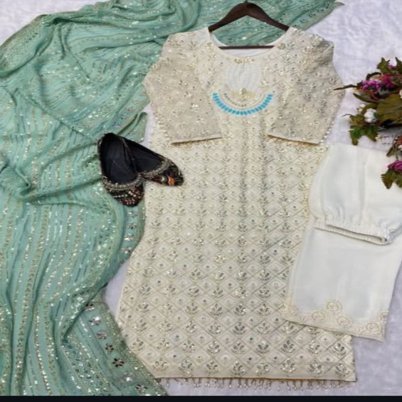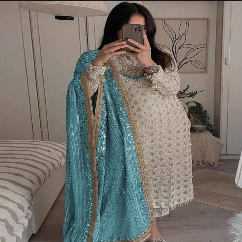 অফ-হোয়াইট বেসে সূক্ষ্ম এমব্রয়ডারির কাজ, সঙ্গে সি-গ্রিন শেডের হেভি ওয়ার্কড দুপাট্টা—“পদ্মজা” আপনার লুকে এনে দেবে রাজকীয় ও পরিমিত সৌন্দর্য। গোল্ডেন বর্ডার ডিটেইলিং পুরো আউটফিটে যোগ করেছে এক বিশেষ অভিজাত ছোঁয়া।